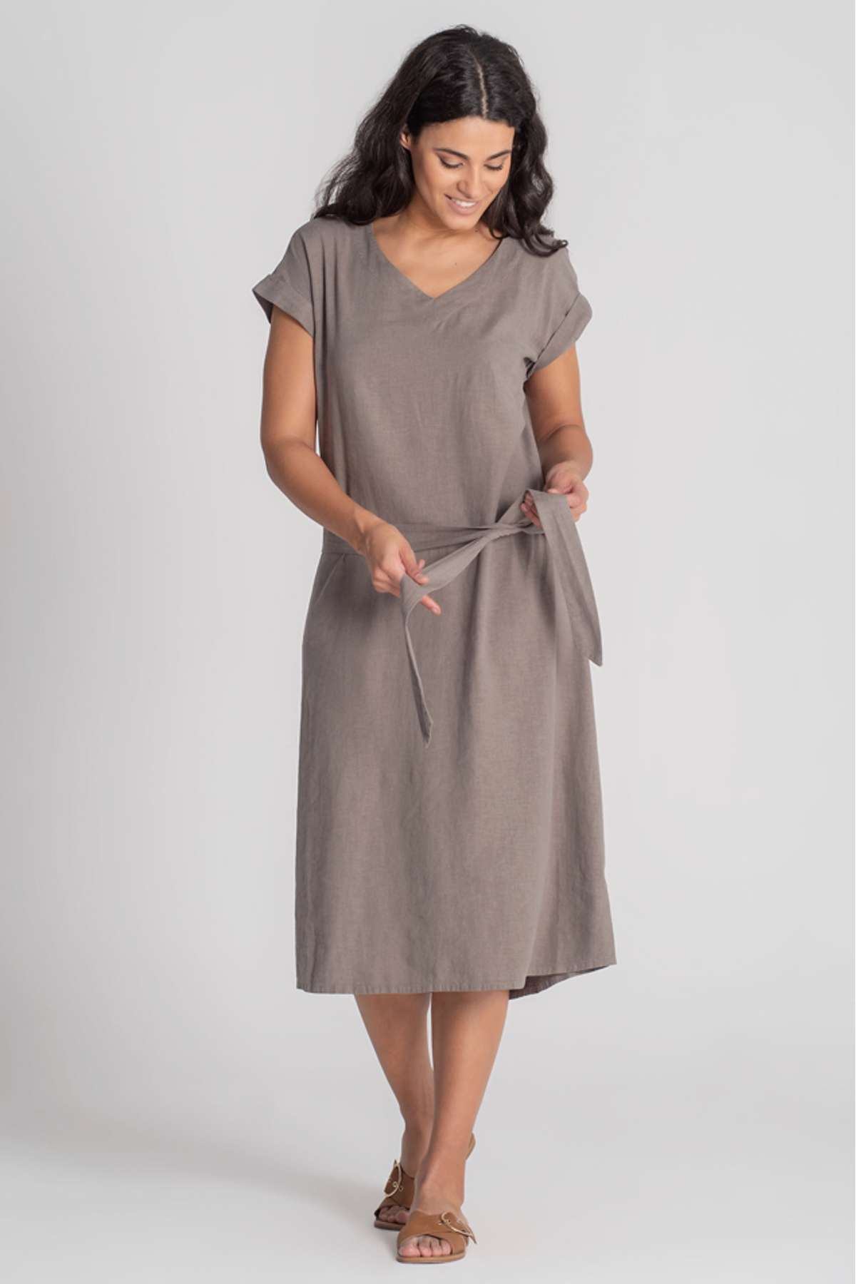 • Stretch materiale for et perfekt fit• Style: Kjole• Farve: Taupe• Pasform: Casual fit• Længde: Knæ• Materiale: 59% Linnen, 39% viskose, 2% elastan